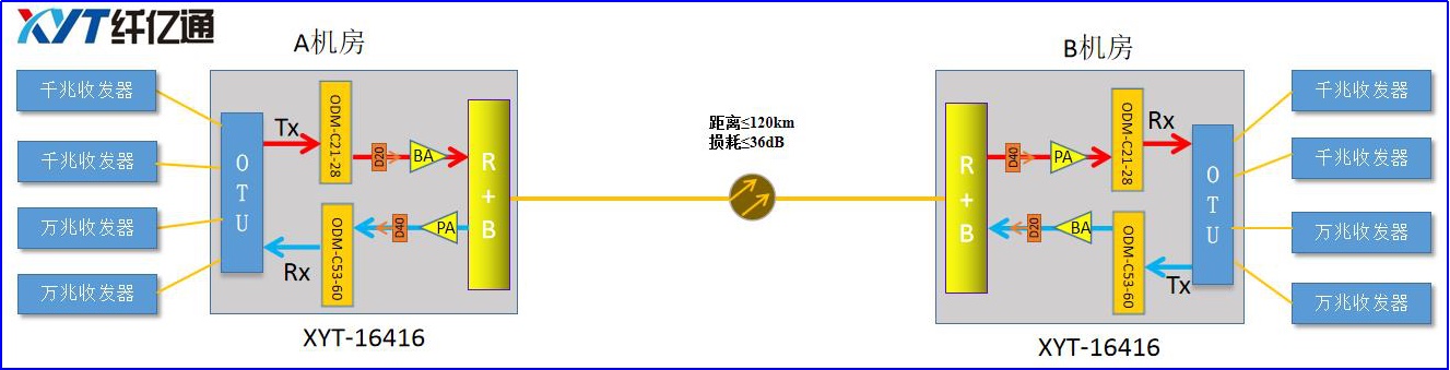 The fiber media converter of the corresponding rate is used to convert the customer electrical signal into an optical signal and converge to the OTU of the fiber optic device XYT-16416, and then the optical signal converted into a specific wavelength by the OTU is connected to the wavelength division card ODM. The optical signal is compensated by the dispersion compensation plate and the optical plate, and the single core and the double fiber are transmitted through the R+B card and the optical signal from the opposite end. After the optical signal is transmitted to the opposite end, the optical transceiver is used to restore the original electrical signal for the customer to use.