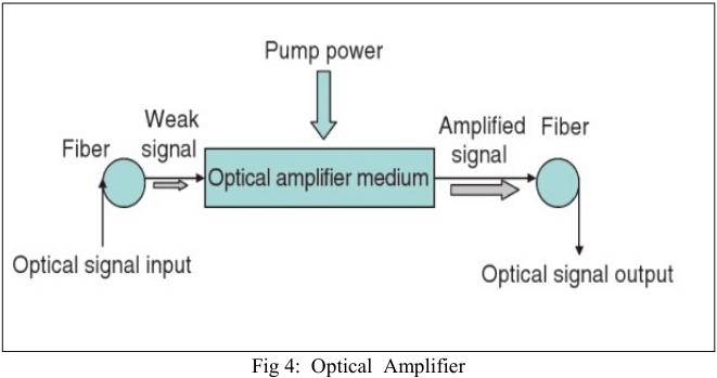 2. Optical amplifiers: The optical signal (light) can be amplified directly using optical amplifiers without first converting it to the electrical signal.These amplifiers add gain or boost the amplitude of optical signals by simulating the photons of signal with extra energy. EDFA are the optical repeaters that amplify the optical signal. The silica based optical fibers are doped with erbium to improve the power of wavelength.[4]