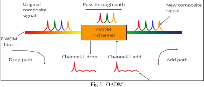 existing multi wavelength signal. DROP means to remove channel passing signal to another path. The incoming signal is broken into two components i.e. drop and pass through. The signal that is dropped is passed to the receiver of client device and the pass through signal is multiplexed with new signal stream. [5]