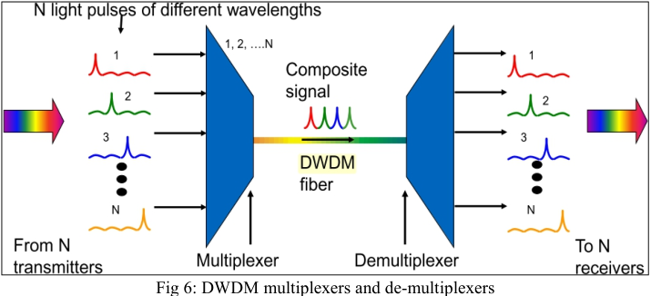 1. Transmitters/ Receivers: DWDM transmitters consist of a large number of transmission LASERs are multiplexed into a single fiber. A large number of individual lasers with different wavelengths are used to create individual channels of DWDM system [3]. Pulses of light are created by laser and each pulse has a particular wavelength (known as LAMBDA). A physical layer device is used to convert the incoming electrical signal to light signal. These pulses propagate through fiber using the phenomenon of total internal reflection. At the receiver end the light signal is converted to the electrical signal using an optical sensor called photodiode.