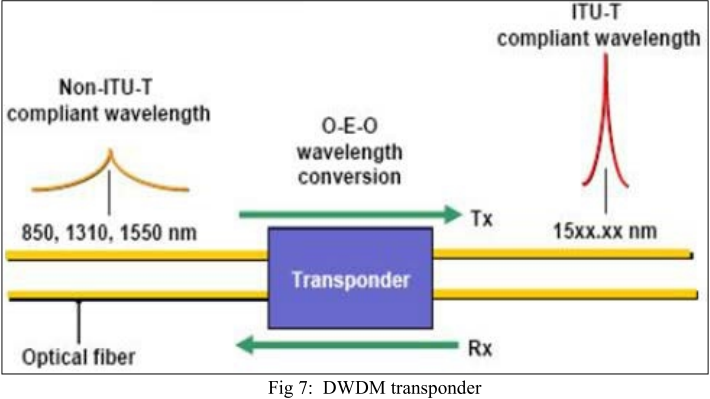5. Transponder (wavelength converter): Transponder is a device that is used to send and receive signals from fiber and these are used to convert full duplex electrical signal to full duplex optical signal. These convert optical signal of one wavelength to optical signal of another wavelength suitable for DWDM applications. These are also known as optical –electrical-optical (O-E-O) wavelength converters. Thus these are useful for optical communication but these are bulky and consume more power.