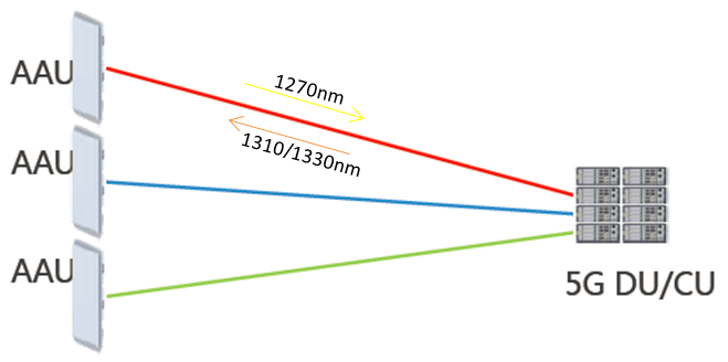 First, in the scene where optical fiber resources are rich, the scheme of optical fiber direct connection, also called One Fiber One Cell, can be deployed with 25G BiDi SFP28 optical transceivers for 10km/20km transmission. In general, there are three cells in one base station. So, the BiDi scheme only needs three optical fibers to meet the fronthaul traffic of one base station, and is conducive to the high precision synchronization of the clock. Among them, the downstream wavelength may be 1310nm or 1330nm, which is uncertain at the moment.