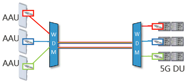 Of course, the more efficient way is to sink the WDM devices directly to the base station and DU, that is, the active WDM scheme, which can be compatible with the current network 2G/3G/4G service, and can achieve more L3 layer business management and optimization functions. However, this scheme will increase the CAPEX.