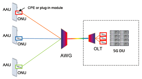 Third, in the scene where backbone optical fiber resources are destitute, the passive WDM scheme with point to multipoint (P2MP) converging the traffic of multiple base stations to one DU, also called One Fiber N Sites (Base-station), can be deployed. For example, the commonly used 40 channel AAWG DWDM Mux/Demux can cover 6 base stations (each base station has 3 sectors, a total of 18 AAUs, 20 channels for upstream and 20 channels for downstream). This topology conforms to the PON based optical passive network and maximizes the utilization of the existing ODN networks.