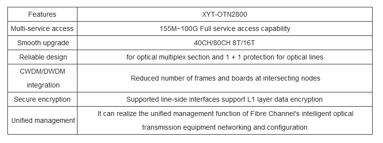 XYT-OTN2800 multi-service optical transmission platform, including 1U / 2U / 5U / 10U chassis, can realize large-capacity transmission. Support AC 220V AV and -48V DC DC power supply, support 1 + 1 power protection.