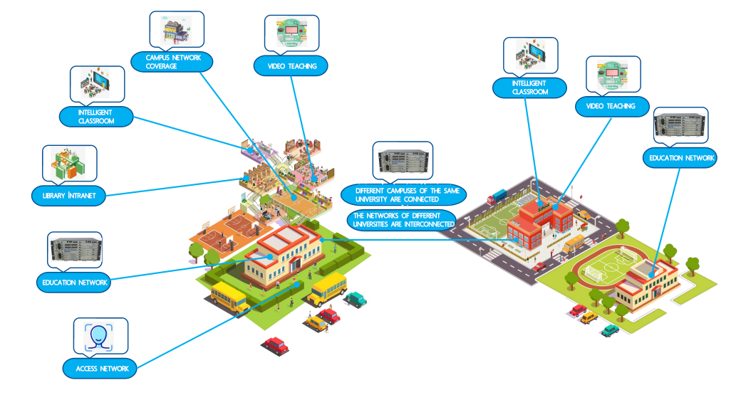 The interconnection of the private network of colleges and universities allows schools to exchange information and knowledge: smart classrooms, remote teaching interaction, multimedia intelligent control, online science communication, online lesson evaluation, remote lecture tour, multimedia broadcasting, etc.