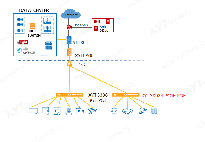 1. The master device adopts XYTP300 OLT, XYTG308 and XYTG3024 ONU to form a passive optical network access scheme for unified carrying of monitoring/broadcasting/multimedia and multi-services.