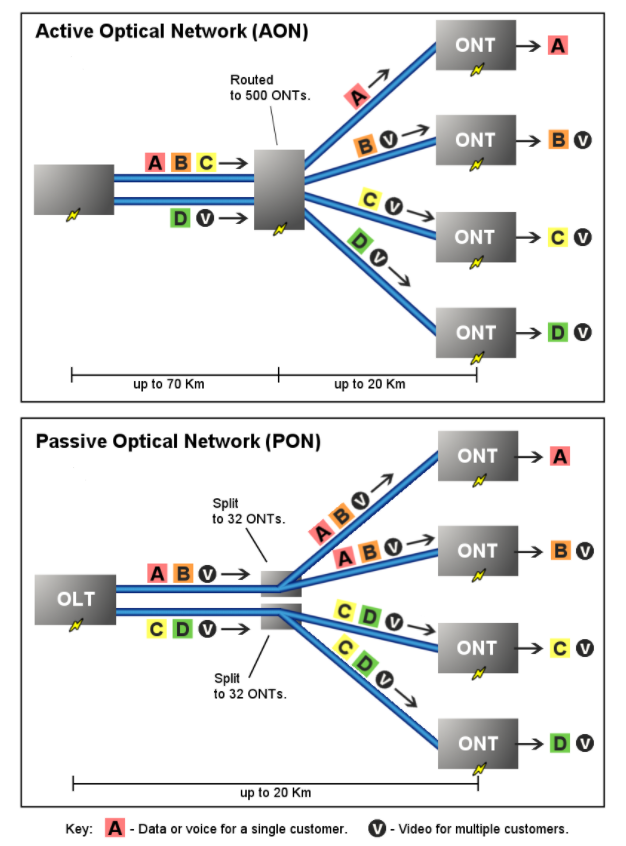 It is universally known that fiber optics transmit data by light signals. As the data moves across a fiber, it needs separated ways to arrive at the targeted places. Generally, there are two essential types to realize it: active optical networks (AON) and passive optical networks (PON). They are both able to provide ways to separate data and route it to the proper places. Nowadays, server providers invest billions of dollars in their access networks to meet the ever-increasing demand for high-bandwidth broadband. In addition to technology longevity, server providers also like to see technology evolution to ensure future consumer demands can be met. Consequently, the development of the network PON type is on the rise.