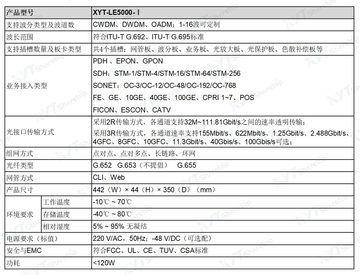 XYT-LE5000系列是纤亿通科技推出的新一代光传输系统,该系统业务集成度高,端口密度大,可接入业务类型丰富,配置灵活,并支持基于SNMP协议的图形化管理界面,可进行远程管理,功能设置,同时可以对局端机架的工作环境温度,工作电压, 冗余电源备份状态, 散热风扇工作状态实时监测。 为管理、维护提供非常清晰的故障定位,节省维护成本。