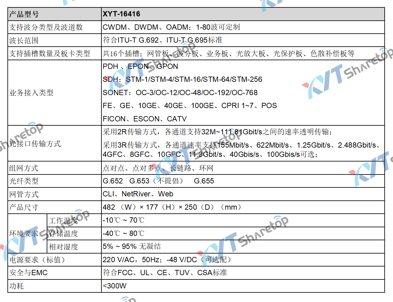 XYT-16416系列产品是一款支持多种业务接入的有源波分系统,该系统业务集成度高,端口密度大,配置灵活,传输容量大。