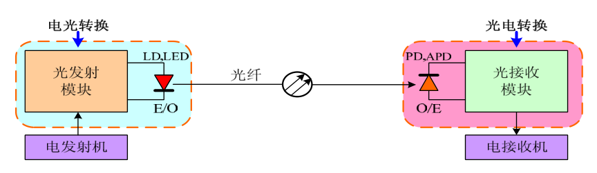 光模块用于光信号的传输,传输介质为光纤。光纤传输方式损耗低,传输距离远,在长距离传输方面具有很强的优势。光收发模块由光电子器件、功能电路和光接口组成,光电子器件包括发射和接收两部分。发射部分是:输入一定码率的电信号经内部的驱动芯片处理后驱动半导体激光器(LD)或发光二极管(LED)发射出相应速率的调制光信号,其内部带有光功率自动控制电路,使输出的光信号功率保持稳定。接收部分是:一定码率的光信号输入模块后由光探测二极管转换为电信号。