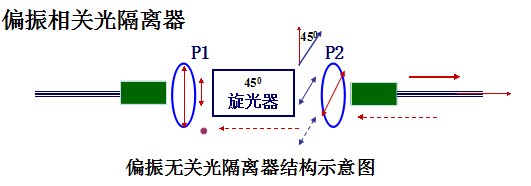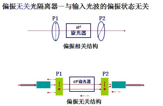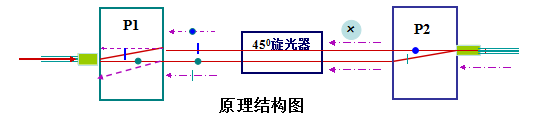 P1将入射光波分为o光和e光,传播方向有一夹角法拉第旋光器将两出射光的偏振面各自向同一个方向旋转450两个光的振动方向平行于第二个晶体中的e光和o光的振动方向,因此被P2折射成两束间距很小的平行光并被耦合到光纤纤芯中。